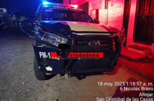 Yolanda Rodríguez/ corresponsalSan Cristóbal de Las Casas, 18 de mayo del 2025.- Una persecución policial se registró esta madrugada en la colonia El Paraíso, luego de que un conductor en aparente estado de ebriedad impactara dos patrullas municipales y tratara de huir. Los agentes detectaron un Jeep Patriot gris que …