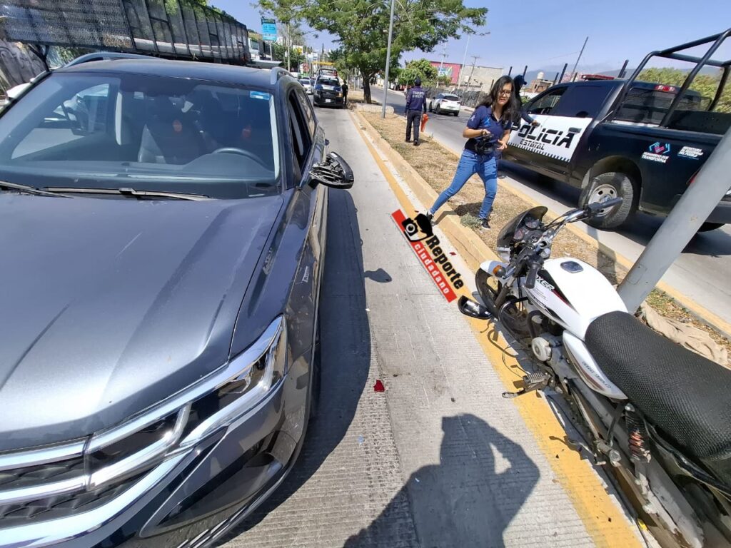 El reporte de tránsito dio a conocer que el conductor de la moto Bóxer de color blanco circulaba de de Poniente a Oriente cuando se le atravesó un Vw Taos de color gris.