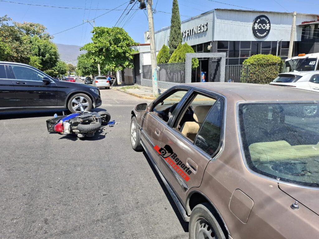 Agencia ReporteCiudadano, 26 de febrero del 2026. -Una motoneta de color negro con azul y y un automóvil Honda Accord de color arena colisionaron en el cruce de la 9a Sur y 8a Poniente.