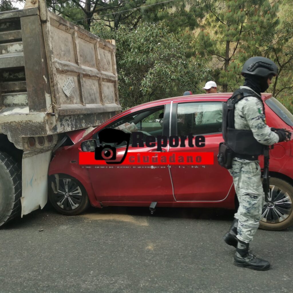 El percance involucró a un vehículo compacto de color rojo y un camión de volteo, resultando en un fuerte impacto que dejó el automóvil incrustado en la parte trasera de la pesada unidad. Dos personas que viajaban en el automóvil resultaron lesionadas.