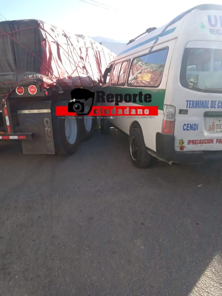 11 de abril del 2025. San Cristóbal de Las Casas.- La mañana de este viernes se registró un choque sobre el Periférico Norte, a la altura de la colonia Palestina, luego de que el conductor de un colectivo no concesionado de la ruta Zona Norte–UNICH fuera impactado por un tráiler.
