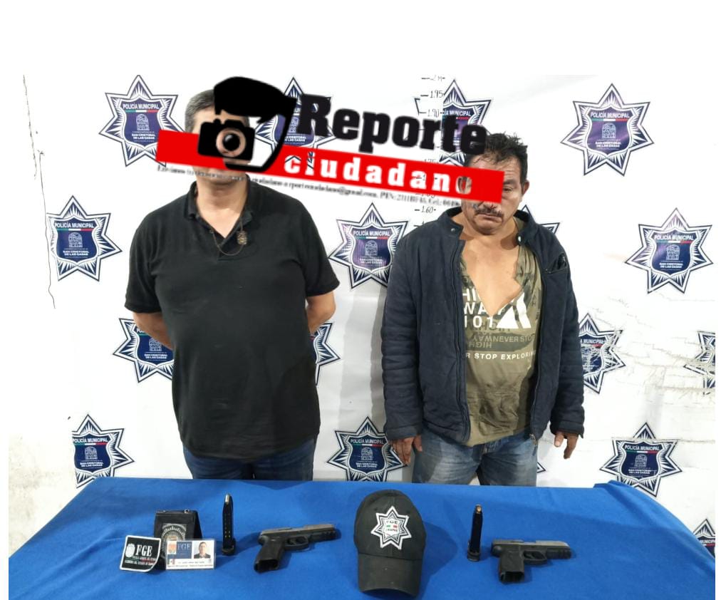 Los sospechosos, identificados como Jorge “N”, de 53 años, y Julio César “N”, fueron sorprendidos en posesión de armas tipo escuadra marca Taurus, ambas abastecidas, y documentación falsa. Julio César “N” incluso se presentó como agente ministerial de la Fiscalía General del Estado (FGE), pero su credencial resultó ser falsa.