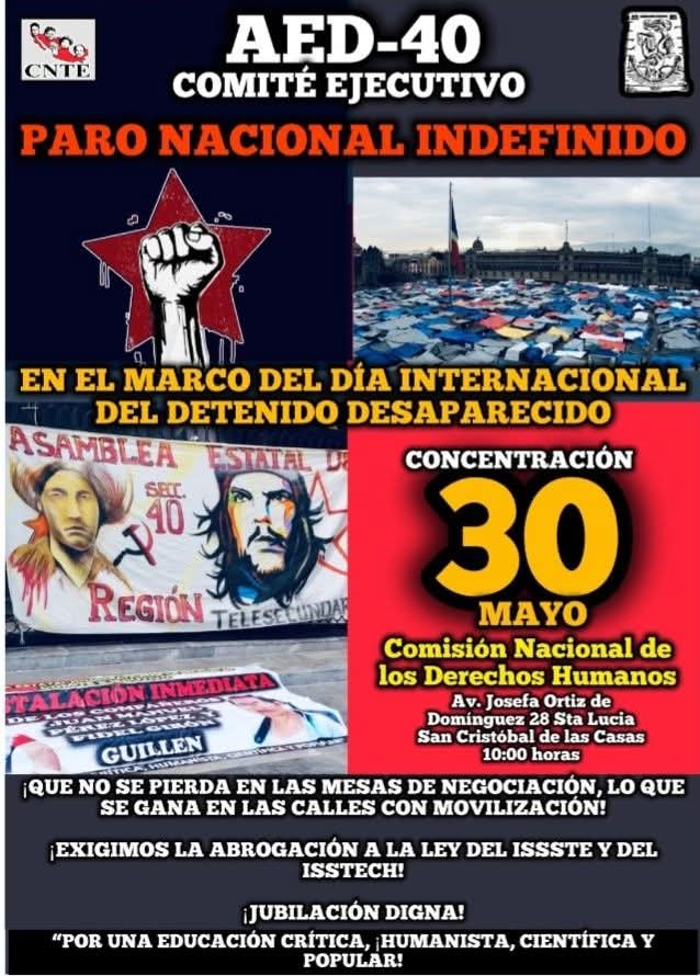 29 de mayo del 2025. San Cristóbal de Las Casas.- En el marco del paro nacional promovido por la Coordinadora Nacional de Trabajadores de la Educación (CNTE), docentes pertenecientes a la Asamblea Estatal Democrática (AED) de la Sección 40 anunciaron una movilización este viernes 30 de mayo, coincidiendo con el Día Internacional del Detenido Desaparecido.