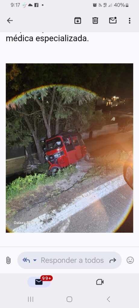 2 de junio del 2025. San Cristóbal de Las Casas.- Un mototaxi sufrió un aparatoso accidente al salirse de la carretera federal que conecta Teopisca con San Cristóbal de Las Casas, a la altura de la comunidad de Betania. La unidad terminó en el fondo de un barranco de aproximadamente 15 metros de profundidad.