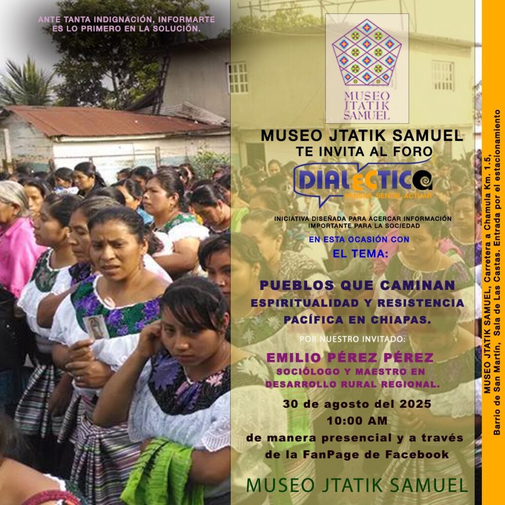 Asimismo, dio a conocer que el próximo 30 de agosto se llevará a cabo el octavo Foro Dialéctico del año, el cual contará con la ponencia “Pueblos que caminan”, a cargo del investigador chol Emilio Pérez Pérez, quien abordará reflexiones sobre la identidad y las luchas de los pueblos originarios.