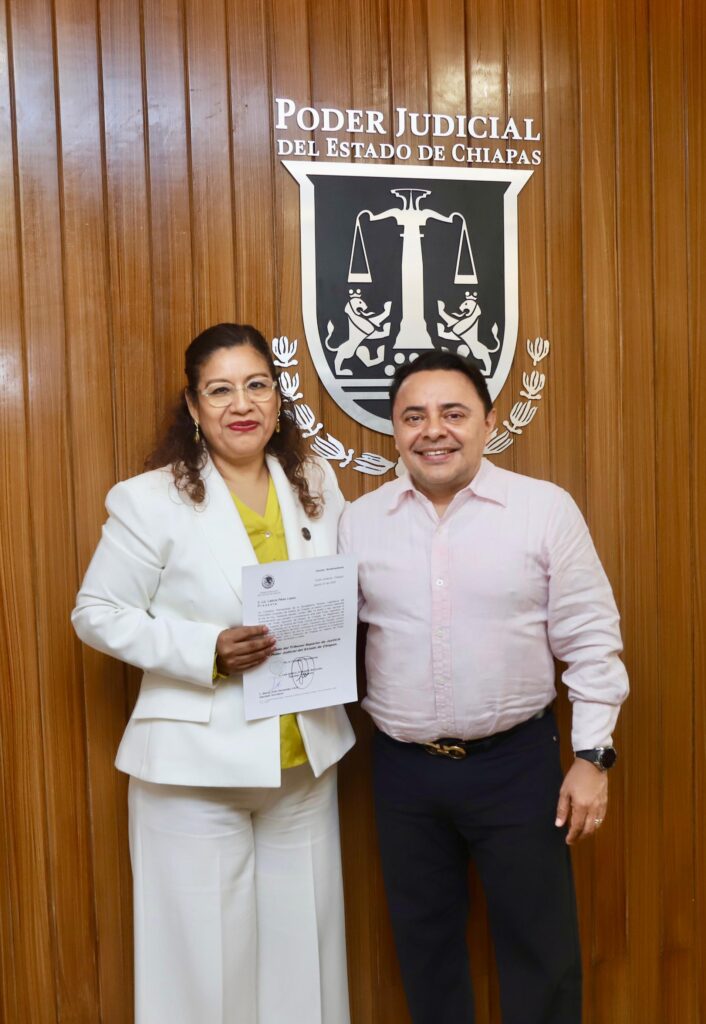 20 de agosto del 2025. El magistrado presidente del Poder Judicial del Estado de Chiapas, Juan Carlos Moreno Guillén, sostuvo una reunión con la recién nombrada magistrada Leticia Pérez López, quien se desempeñaba como jueza de lo familiar.