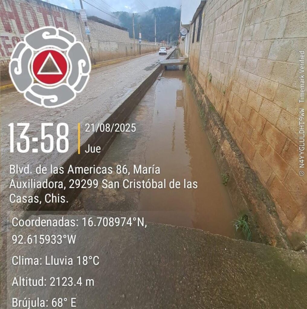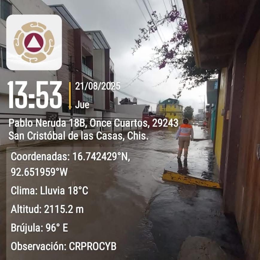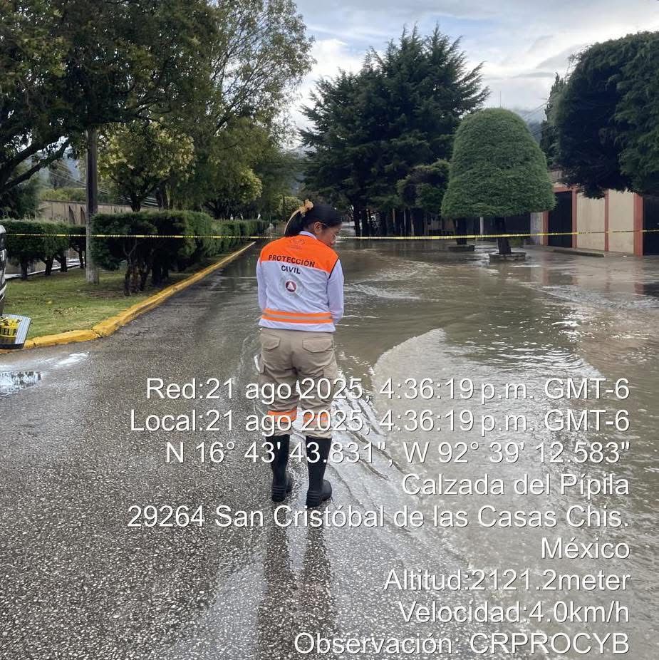 San Cristóbal de Las Casas, 21 de agosto de 2025.– La Dirección de Protección Civil Municipal informó que, tras las lluvias registradas la tarde de este jueves, se mantuvo vigilancia en las zonas con antecedentes de encharcamientos e inundaciones, reportando únicamente afectaciones menores. El director de la dependencia, Pablo Reyes Aguilar, detalló que en varios puntos de la ciudad, como la Calzada del Cementerio y la colonia 11 Cuartos, se presentaron encharcamientos a nivel de banqueta, mientras que los principales puentes operaron entre un 30 y 80% de su capacidad, sin representar riesgos mayores.