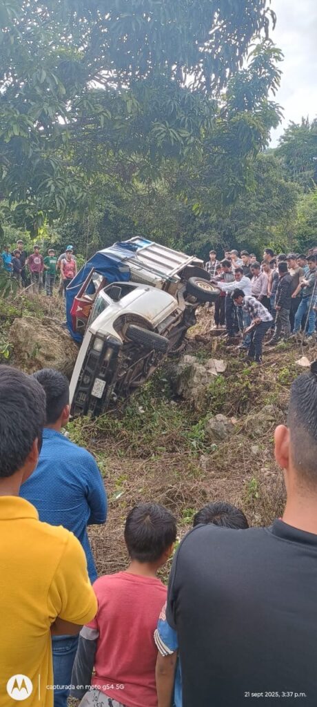 21 de septiembre del 2025. Tuxtla Gutiérrez.- San Cristóbal de Las Casas.- En la comunidad de Potojtic, municipio de Zinacantán, una camioneta volcó luego de que su conductor perdiera el control del vehículo, presuntamente debido al exceso de velocidad y a lo resbaladizo del pavimento ocasionado por la lluvia. El percance generó la movilización de habitantes, quienes acudieron de inmediato para auxiliar.