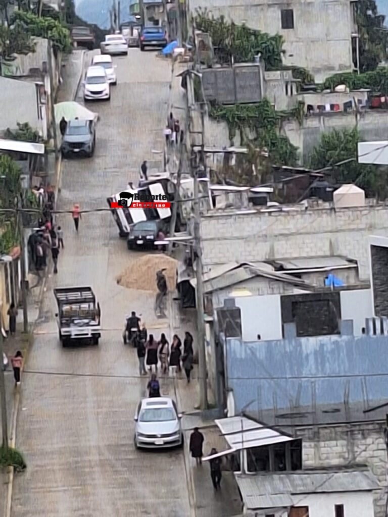 22 de septiembre del 2025. San Cristóbal de Las Casas.- Un camión volteo sufrió una falla mecánica cuando, al parecer, se quedó sin frenos en una pendiente de la comunidad San Antonio del Monte. La pesada unidad terminó impactando contra un vehículo que se encontraba varado en el lugar.