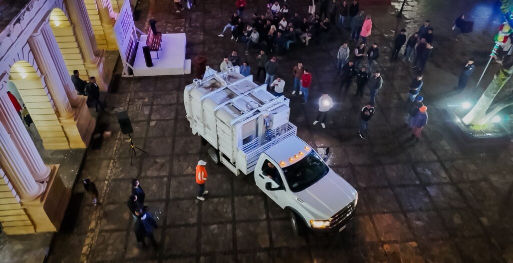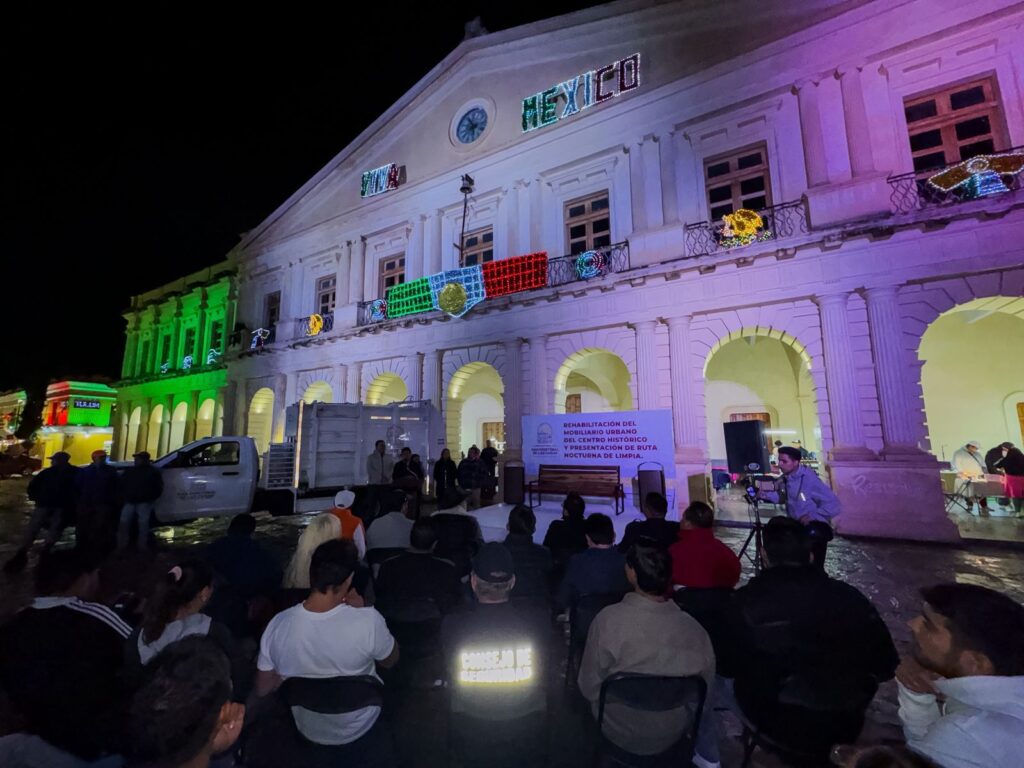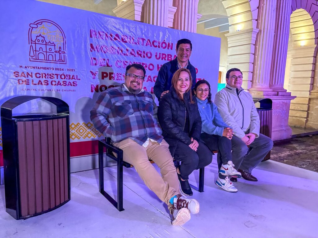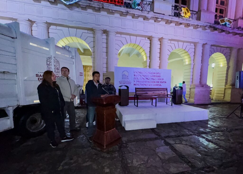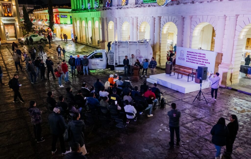 San Cristóbal de Las Casas, 27 de septiembre de 2025.- La presidenta municipal, Mtra. Fabiola Ricci Diestel, dio inicio a la rehabilitación del mobiliario urbano del Centro Histórico y presentó la nueva ruta nocturna de limpia, con el objetivo de mantener en óptimas condiciones la imagen de la ciudad.