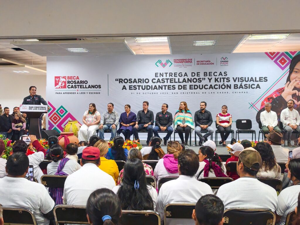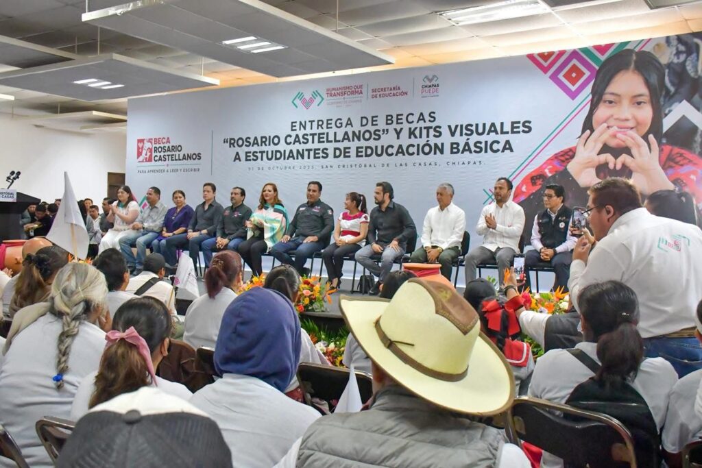 San Cristóbal de Las Casas, 01 de octubre de 2025.- La presidenta municipal, Mtra. Fabiola Ricci Diestel, acompañó al gobernador de Chiapas, Dr. Eduardo Ramírez Aguilar, en la entrega de becas “Rosario Castellanos” y kits visuales a estudiantes de educación básica, en un acto que reunió a cientos de familias y estudiantes de diferentes instituciones de San Cristóbal y Chamula.