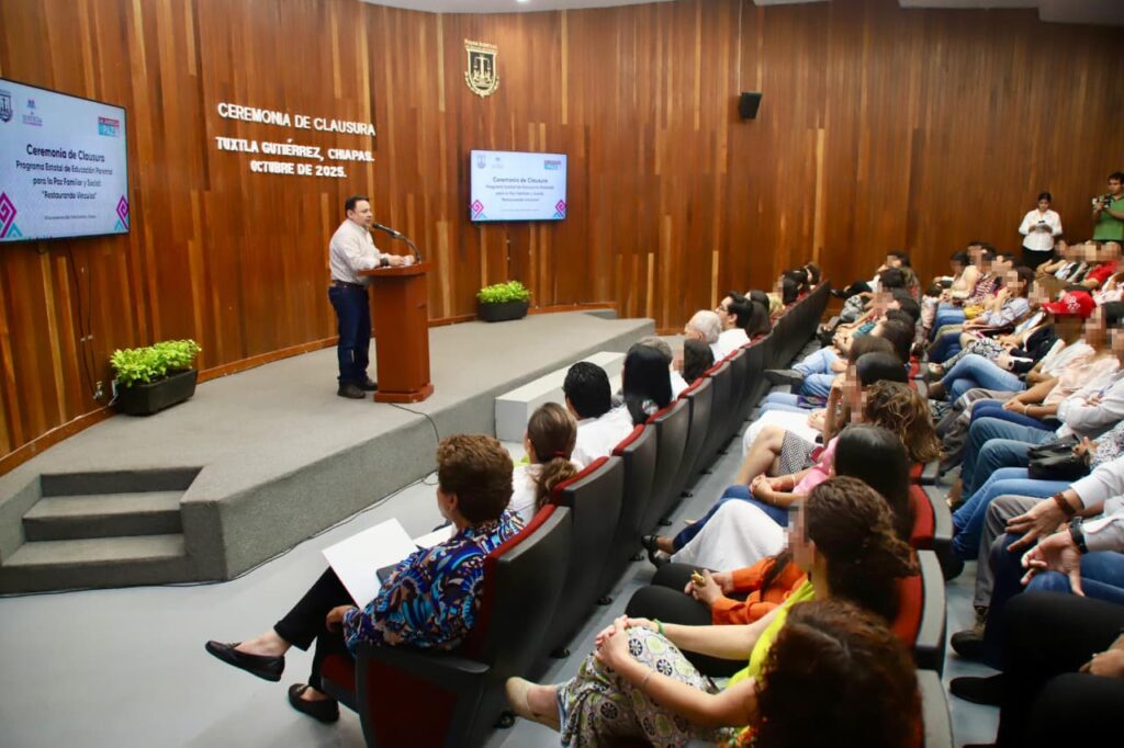 3 de octubre del 2025. El Poder Judicial del Estado de Chiapas realizó la clausura del Programa Estatal Parental para la Paz Familiar y Social: “Restaurando Vínculos”, una iniciativa que impulsa el magistrado presidente Juan Carlos Moreno Guillén para fortalecer las habilidades parentales de madres, padres y personas cuidadoras, involucradas en juicios de divorcio, guarda, custodia y derecho de visita y convivencia.