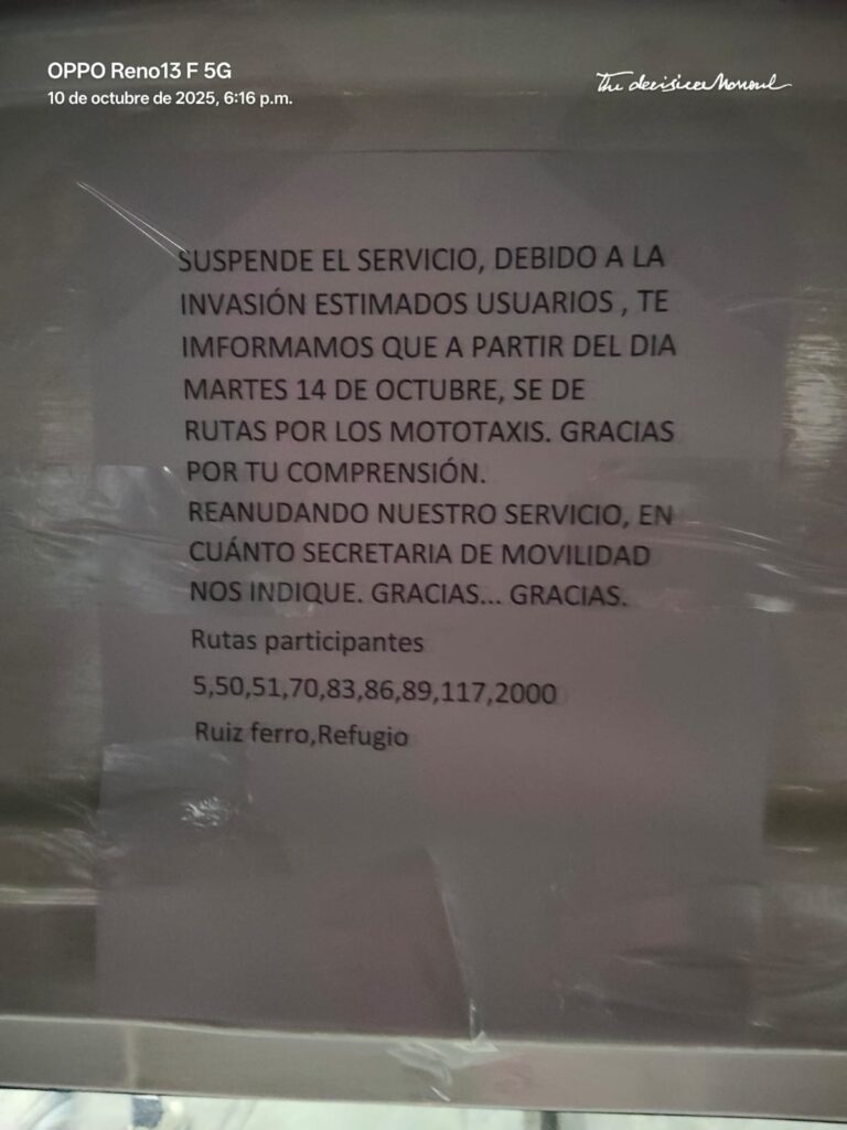 12 de octubre del 2025. Tuxtla Gutiérrez.- Ante la indiferencia de las autoridades de Movilidad y Transporte conductores de diferentes rutas que realizan el recorrido principalmente en la zona Oriente de Tuxtla Gutiérrez han iniciado un movimiento para exigir detener la invasión de mototaxis, una situación que afecta severamente su operatividad.