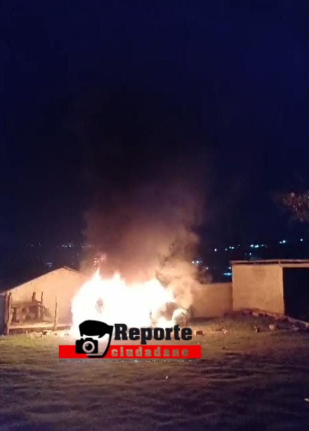 17 de noviembre del 2025. San Cristóbal de Las Casas.- Un automóvil terminó envuelto en llamas la tarde de este lunes frente a una institución educativa ubicada en la comunidad de Bechijtik Uno, en el municipio de Chamula.