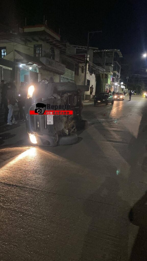 23 de noviembre del 2025. San Cristóbal de Las Casas.- Una camioneta Toyota Hilux terminó de costado sobre la Prolongación Insurgentes, a la altura del barrio María Auxiliadora, luego de que su conductor perdiera el control del vehículo. Testigos en el lugar señalaron que el automovilista manejaba a alta velocidad y presuntamente bajo los efectos del alcohol.