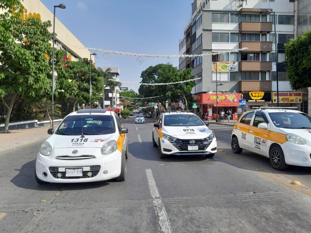 5 de diciembre del 2025. Tuxtla Gutiérrez, Chiapas. – Conductores del servicio de taxi concesionado realizaron una caravana pacífica este miércoles, desde la Fuente Diana Cazadora hasta el Parque Central, para exigir al gobierno estatal medidas que regulen la operación de las plataformas digitales de transporte, a las que acusan de competencia desleal.