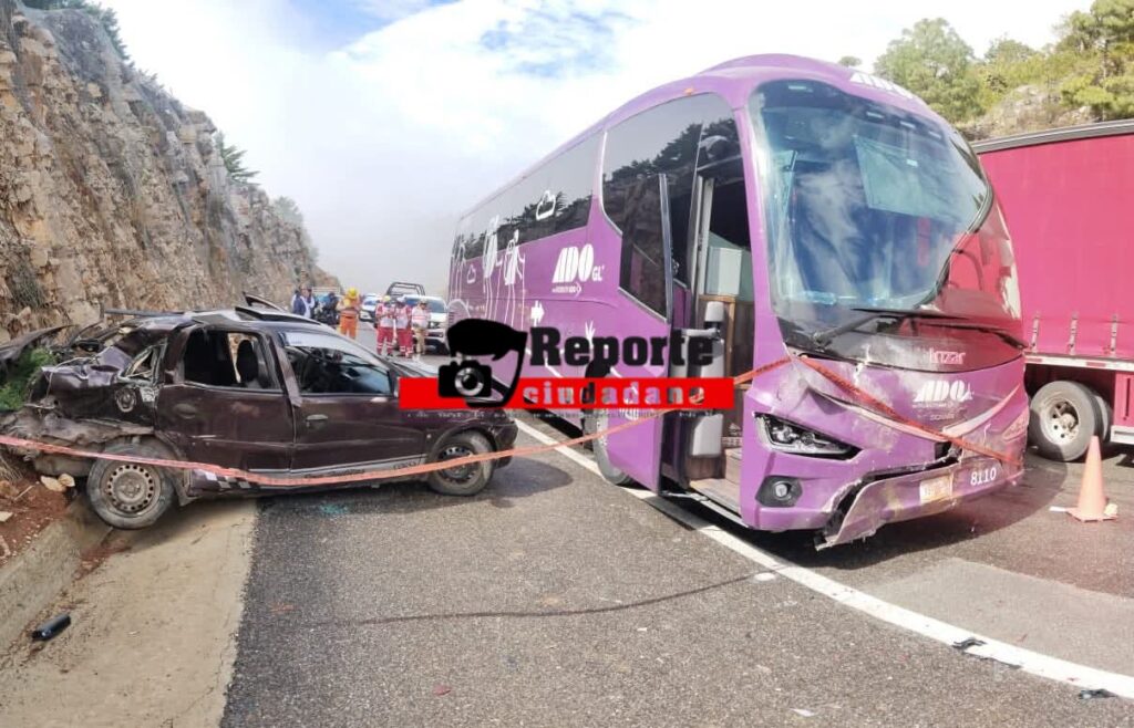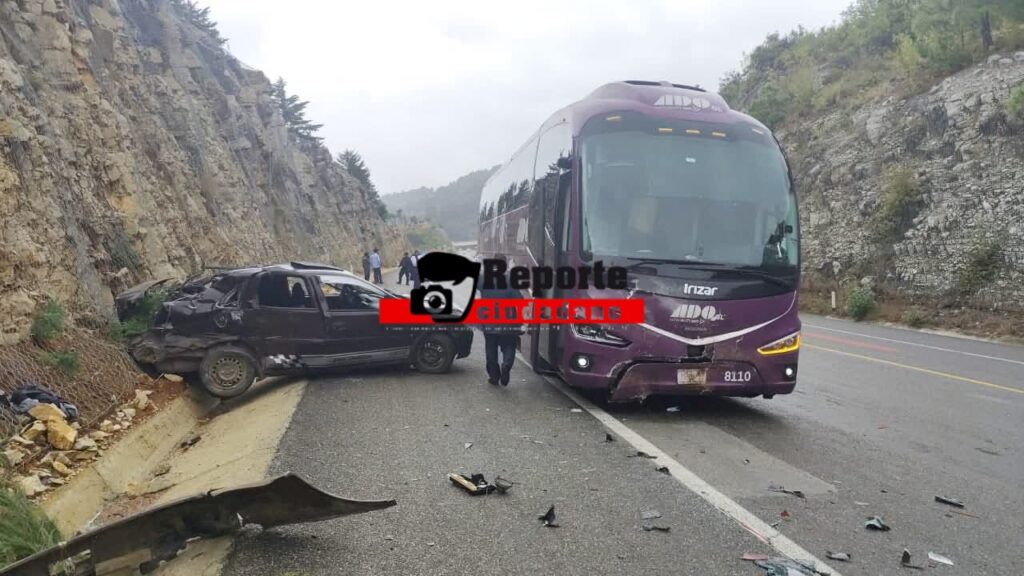 9 de diciembre del 2025. San Cristóbal de Las Casas.- Dos personas fallecieron este martes luego de un fuerte accidente registrado a la altura del kilómetro 36+600 de la carretera de cuota San Cristóbal–Chiapa de Corzo, donde un autobús de la línea ADO se vio involucrado en un choque frontal contra un automóvil Chevrolet Corsa. El impacto dejó el auto prácticamente destruido.
