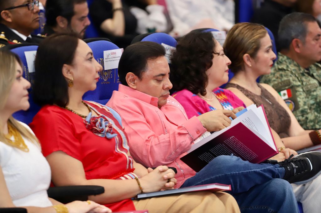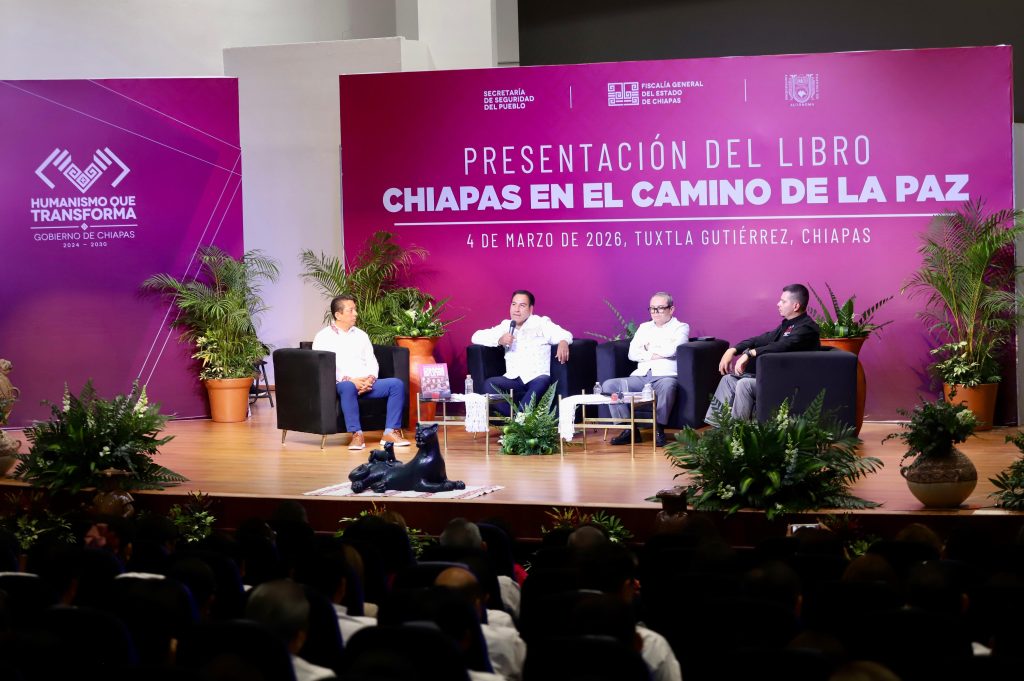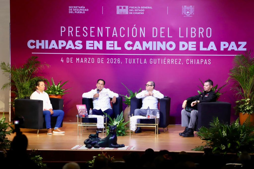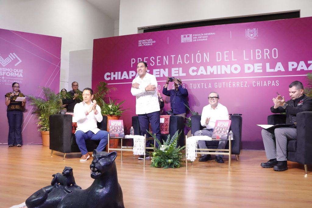 Posteriormente, asistió a la presentación de la obra “Chiapas en el camino de la paz”, documento que recoge las experiencias y reflexiones del gobernador Eduardo Ramírez Aguilar, y que contó con la colaboración de los titulares de la Secretaría de Seguridad del Pueblo, Óscar Aparicio Avendaño, y de la Fiscalía General del Estado, Jorge Luis Llaven Abarca, en torno a las acciones emprendidas para fortalecer la seguridad y la construcción de la paz en la entidad.