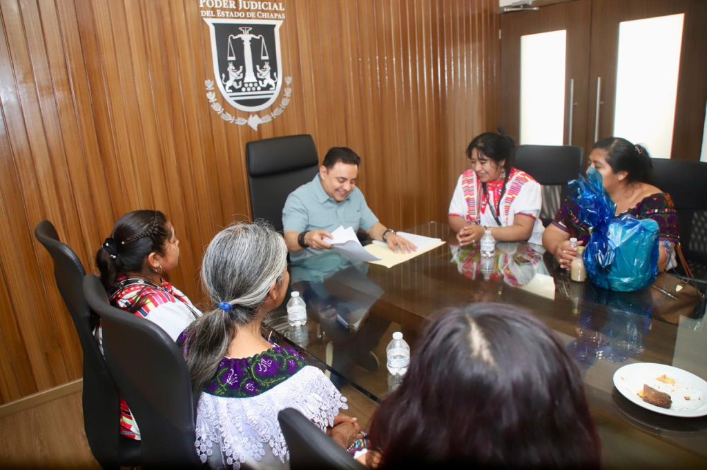 13 de marzo del 2026. El magistrado presidente del Poder Judicial del Estado de Chiapas, Juan Carlos Moreno Guillén, recibió en la sede judicial de Tuxtla Gutiérrez la visita de un grupo de mujeres productoras del programa “Sembrando Vida”, provenientes de las comunidades Patihuitz, Sibacá, 15 de Marzo y San Antonio Toniná de Ocosingo, Chiapas.